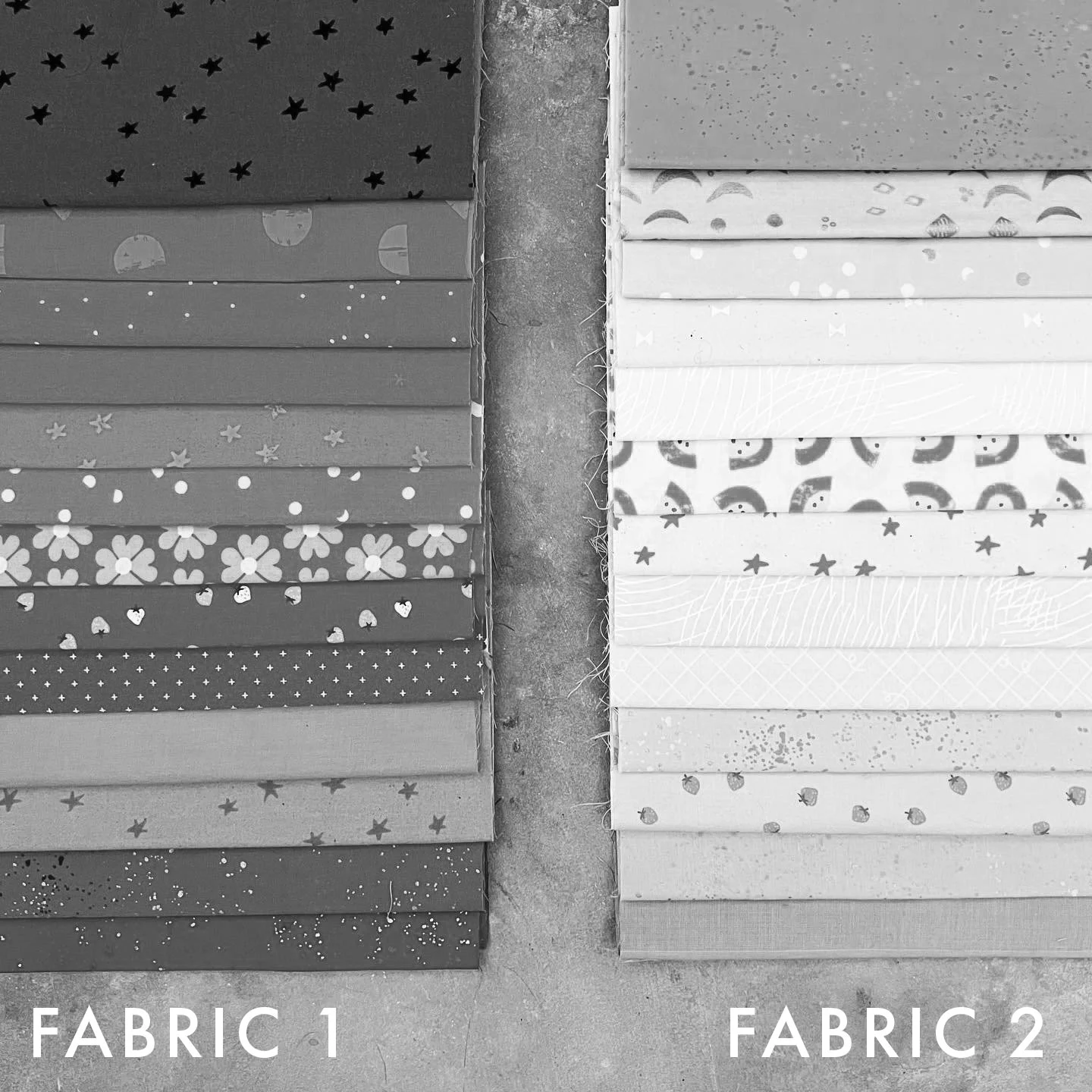 One caveat to all this contrast business is considering color. Below are the fabrics I used to make the full Scrappy version shown just above. In grayscale, you can see that the top fabric in the Fabric 2 stack is actually the same value as a few of the lighter fabrics in the Fabric 1 stack. However, that fabric is a bright, almost highlighter yellow color, and the only like it in the entire quilt. It’s definitely going to pop when mixed with all those other fabrics. I figured that would work in the Fabric 2 stack (and honestly I did not have a lot of low volume prints to fill that column haha) and I think it does!