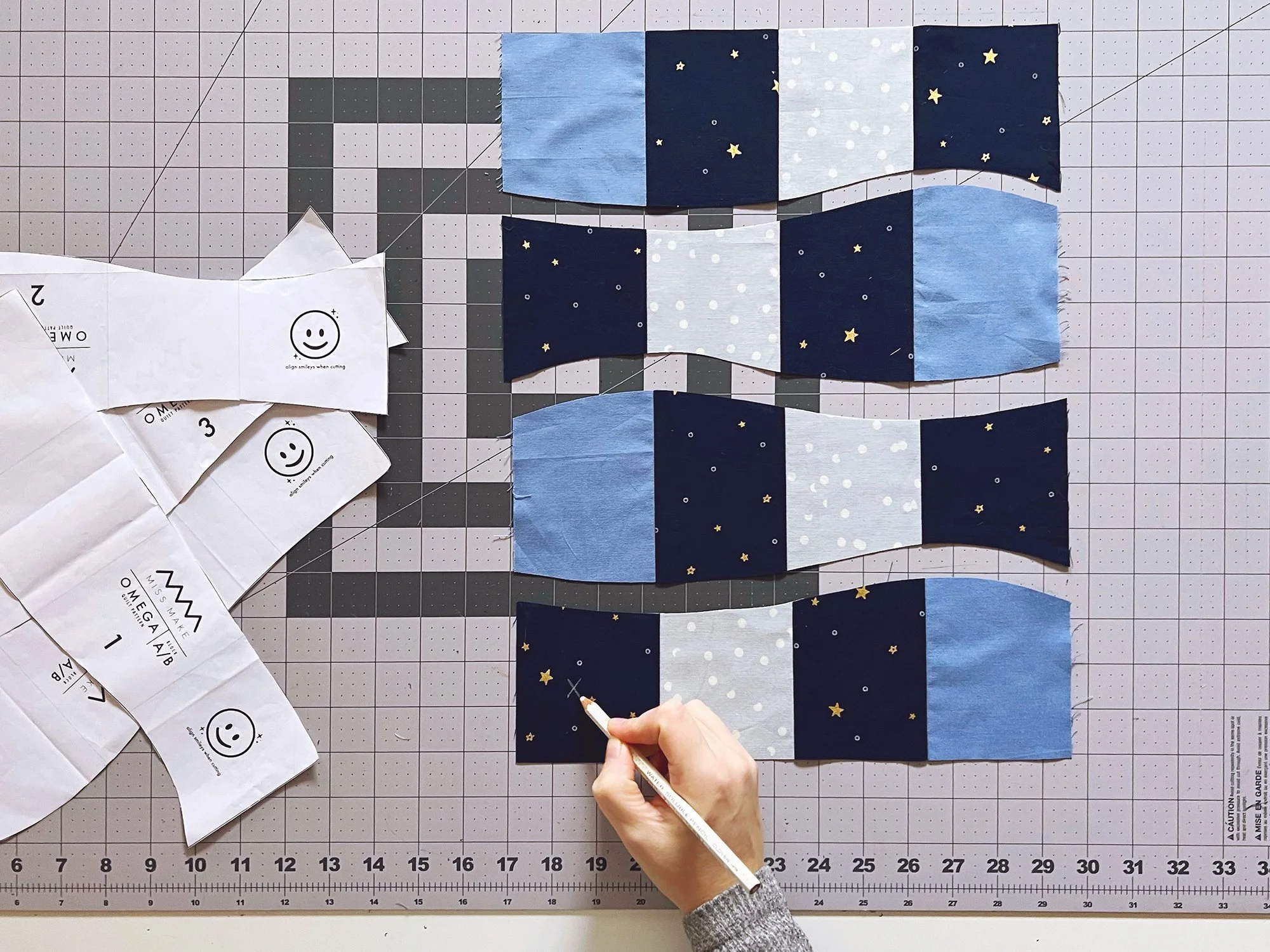 We are more than halfway through the Omega Quiltalong! This week we are going to cut and sew the template pieces for all our Block B’s. Improv layout people are also going to finish up their Block C’s.