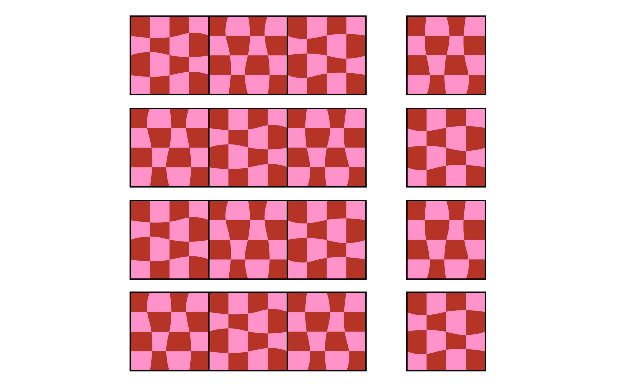 Omega is made up of a checkerboard pattern of Blocks A and B. (So yes, it’s sort of like a checkerboard of smaller wavy checkerboards). The first row is A, B, A, B, etc., the second row is B, A, B, A, etc., the third is A, B, A, B, etc. and so on. This means that the curvy seams alternate both across the rows and down the columns as horizontal, vertical, horizontal, vertical etc. This is what helps create the organic, undulating feel of the wavy lines, instead of your brain immediately seeing the same repeating blocks.